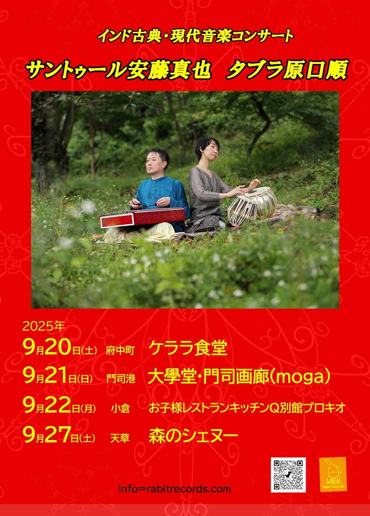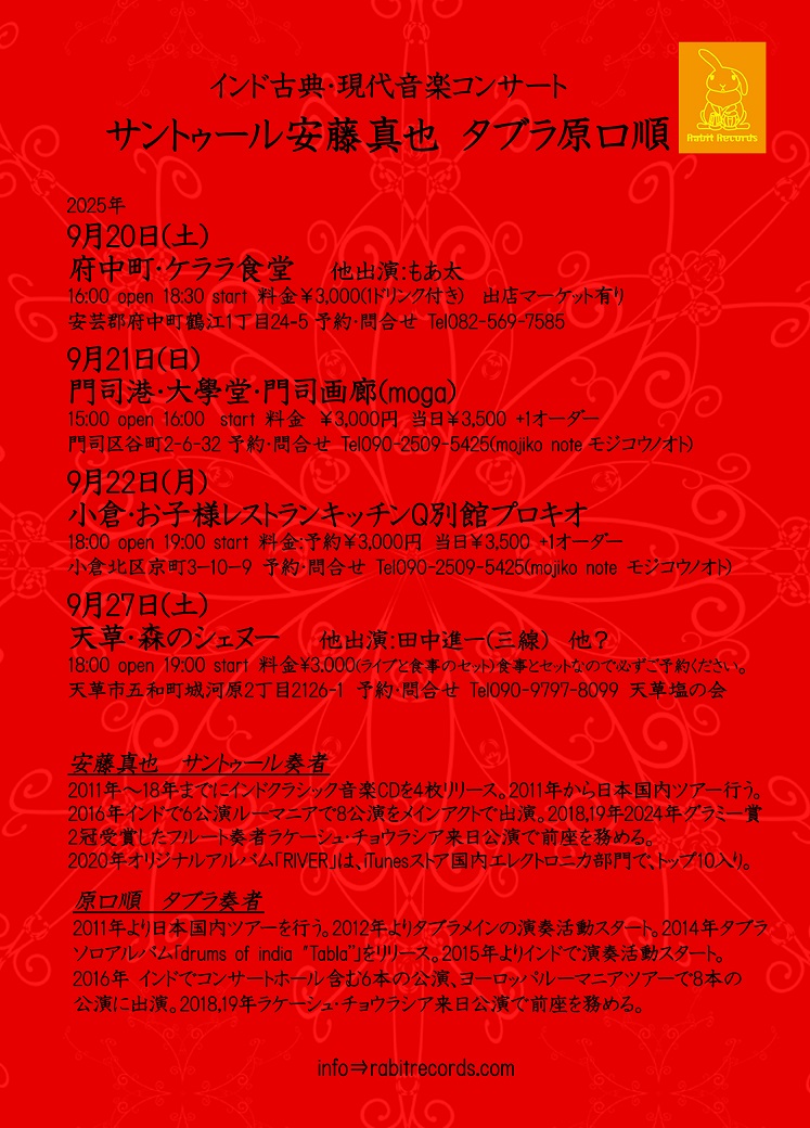 〜秋を聴く 2025〜 夕焼けの色、夜への移ろい、 月を愛で、 彼方を想う、 インドの秋、日本の秋。 ◆10月13日(月祝) 岐阜・Hygge Coffee 12:00 open / 13:00 start 岐阜市六条東2-19-4 予約¥3,000/当日¥3,500 + 1オーダー 予約・問合せ Tel 058-201-6242 ◆10月18日(土) 瀬戸・薬膳茶SoybeanFlour@釜横←SOLD OUT!Thank You! ※瀬戸会場のお席は売り切れとなりました。 11/3の名古屋公演をご検討ください。 17:00 open / 17:30 start 愛知県瀬戸市東町1-6(瀬戸民藝館内) 予約¥3,000 /当日¥3,500 + 施設管理維持費¥200 + 1オーダー 予約・問合せ Tel 0561-78-1711 ◆11月3日(月祝) 名古屋・モノコト 15:00 上映会「ジプシー映画」start(入場無料1オーダーお願いします) 演奏会18:00 start 予約3,000円 / 当日3,500円 共に+1order 名古屋市中区大須2丁目25-4 久野ビル2階 予約・問合せ Tel 052-204-0206 ◎ご予約は各会場の問合先、またはラビットレコーズinfo@rabitrecords.comへお願いします ******************************************************************************************************* 2025年10月 八重山2daysライブツアー インド古典・現代音楽 サントゥール安藤真也 タブラ原口順 10/24(金)石垣・Cafeタニファ 10/26(日)西表島・食堂ワタブンブン ![]() 19:00 open / 20:00 start 沖縄県石垣市大川 188 料金:1,500円 + オーダー 予約・問合せ Tel 090-7471-1510 ◆10月26日((日)) 西表島・食堂ワタブンブン 18:00 open / 18:30 start 沖縄県八重山郡竹富町南風見508-9 料金:1,500円 + 1オーダー 予約・問合せ Tel 050-6883-3396 ◎ご予約は各会場の問合先、またはラビットレコーズinfo@rabitrecords.comへお願いします ******************************************************************************************************* 2025年9月 広島・九州ツアー インド古典・現代音楽 サントゥール安藤真也 タブラ原口順 広島府中町〜門司港〜小倉〜天草 〜移り変わる季節、全てに同じものはなく、 私たちも皆、刻々と進んでゆく。 一期一会の音、その瞬間の音楽をお見逃しなく。〜 9月後半は、毎年この時季お世話になっている、 恒例の広島〜九州への演奏ツアーです。 今年も皆さんにお会いできるのを楽しみにしています!