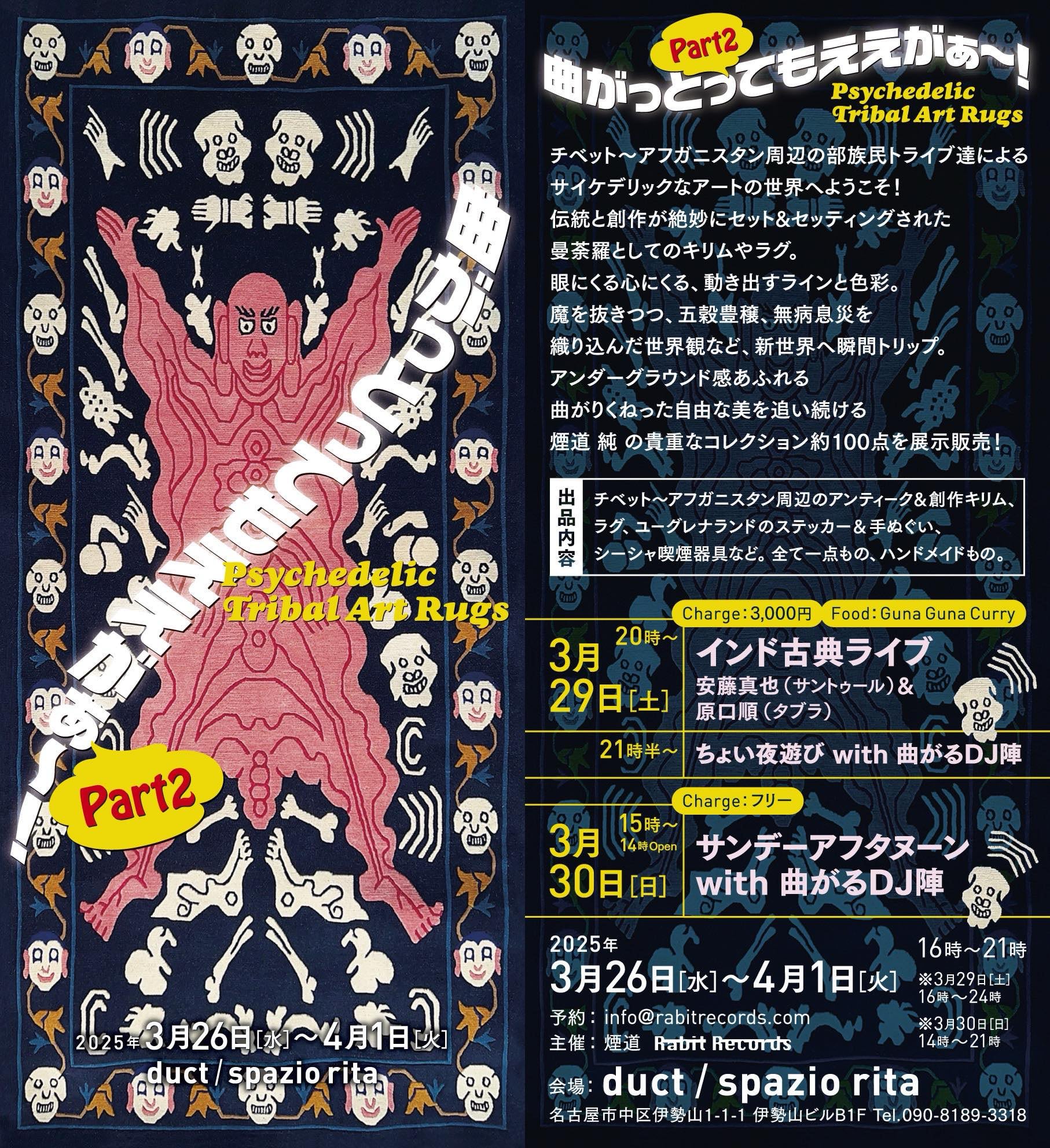 「曲がっとってもええがぁ〜!Psychedelic Tribal Art Rugs Part2!」 名古屋市中区伊勢山1-1-1 伊勢山ビルB1 16:00 open / 20:00 start 料金3,000円+1drinkオーダー チベット〜アフガニスタン周辺の部族民トライブ達による、 サイケデリックなアートの世界! 伝統と創作が絶妙にセット&セッティングされた曼荼羅ラグやキリムなど貴重なコレクションの展示会(3/26〜4/1)で 3/29サントゥール・タブラのライブ。 予約・問合せ Tel 090-8189-3318(spazio rita) メール info@rabitrecords.com(ラビットレコーズ) ※お詫び:諸事情により、GUNAGUNA CURRYの3/29のFOOD出店は中止となりました。 GUNAGUNA CURRYの料理を楽しみにされていたお客様には大変申し訳ありません。 ライブは予定通りあります。 ◆4月5日(土) 京都・FRAME in VOX 16:00 open / 17:00 start 京都市中京区大黒町44 河原町VOXビル3F セカンドステージ共演:由良泰人 予約 3,000円 /当日 3,500円 + 1オーダー インドゆかりの美味しいIPAビールとおつまみにも最高なインドスナック"ナムキン"とともにくつろぐ春の宵! 今回は、1st stageではインドクラシック音楽の春の薫るラーガを。 2nd stageではゲスト由良泰人さんとの共演でインドアンビエントミュージックをお届けします。 予約・問合せ Tel 075-748-1581 (FRAME in VOX) メールinfo@frame-in-vox.com ◆4月12日(土) 岩槻・ChanRee 「神話の国インディア2 (キャーバートハェー(すげぇー!)」 さいたま市岩槻区西町2-1-8 (岩槻駅から徒歩4分) 13:00open 14:00start 大人3,000円 子供1,000円 共に+1オーダー 他出演:インドの神話:師岡絵美里 / ダンス:Rie Haneda 前半はインド哲学研究家で画家の師岡絵美里さんによるインド神話のお話会、 後半は安藤真也・原口順のインドクラシック音楽の演奏会。 インドの素敵なところと自分達に繋がる発見がありますよ! インド料理名人直伝のChanReeの美味しいスパイスカレーやドリンクとご一緒に。 素敵な春の午後を楽しみましょう。 予約・問合せ Tel 090-4154-9069 メールhair6967@icloud.com ◆4月13日(日) 鎌倉・たけのこ庵 鎌倉市笛田5-6-29 15:00open 16:00start 料金4,000円(ライブとハイデラバードビリヤーニーのセット) 春のたけのこ庵は庭の植物や生き物たちが、生命力に満ち溢れています。 繭子さんの作るビリヤーニーは、本場ビリヤーニーの聖地ハイデラーバード仕込みで絶品! ラーガのフレイバーと料理、薫る春の饗宴をぜひ。 予約・問合せ Tel 0467-37-9098 メール takenokoan.kamakura@gmail.com ◆4月19日(土) 敦賀・cafe Tree 敦賀市津内町1丁目3-5 18:00open 19:00start 料金3,000円+1オーダー 敦賀の音楽好きが集うTree cafeはこの春で20周年。 偶然にも、安藤真也もサントゥールを始めて20周年。 お互いさらにすすんでゆく記念となるHappyな春の夜になることでしょう! 予約・問合せ Tel 0770-21-3033 ◎ご予約は各会場の問合先、またはラビットレコーズinfo@rabitrecords.comへお願いします ******************************************************************************************************* 2025年3月29日(土) 名古屋 「曲がっとってもええがぁ〜!Psychedelic Tribal Art Rugs Part2!」 会場:duct/spazio rita (名古屋市中区伊勢山1-1-1 伊勢山ビルB1)