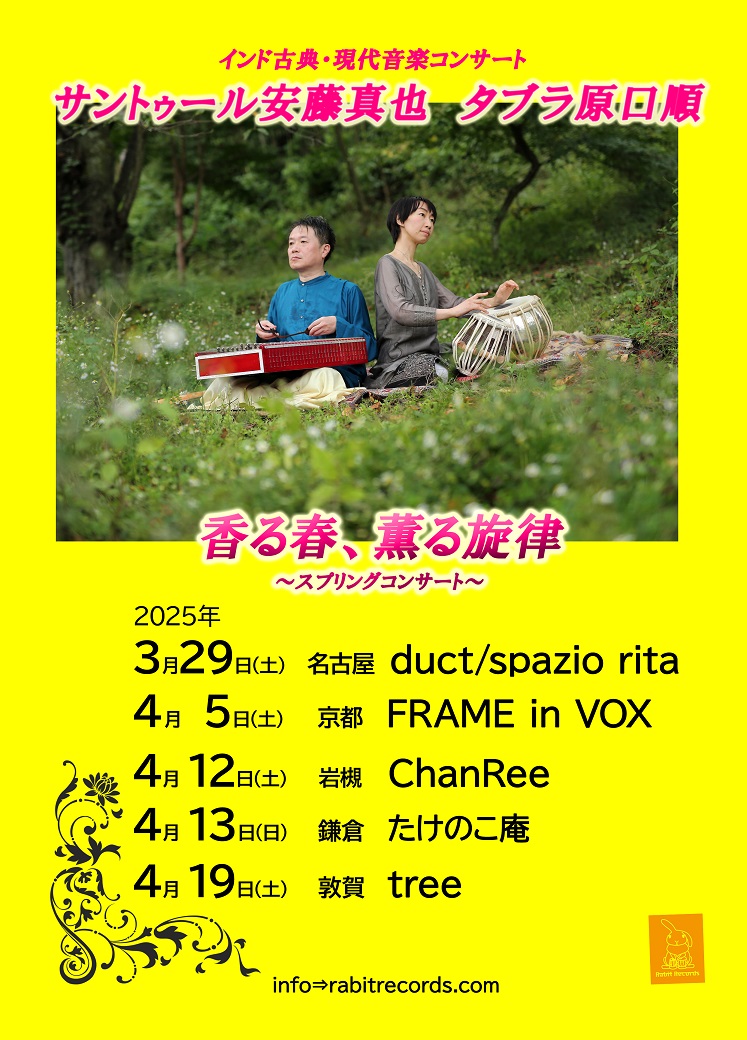 ◆6月22日(日) 名古屋・カレーと民藝と酒TeTe 名古屋市千種区高見1-8-5ケンインターナショナルビル3F 15:00 open/16:00 start 予約¥4.500/当日¥5,000 (コンサートとTeteのカレー&ドリンクのセット料金) 予約・問合せTel 090-9121-8445(Tete) 池下にある老舗・世界の民藝店カサブランカの姉妹店Tete。 異国情緒溢れる店内で、こだわりのインドスパイスカレーを味わい、 現地仕入れのトライバルな品々と共に、 悠久のインドを感じる雨の午後を楽しみましょう。 ◆6月28日(土) 京都・FRAME in VOX 16:00 open / 17:00 start 京都市中京区大黒町44 河原町VOXビル3F 2nd stage インドアンビエントミュージック共演:由良泰人 予約 3,000円 /当日 3,500円 + 1オーダー 予約・問合せ Tel 075-748-1581 (FRAME in VOX) メールinfo@frame-in-vox.com 賑わう河原町三条で川沿いの風情を眺めて会場に到着すれば、 雨の中で日常を忘れる趣深いひととき。 1st stageでは昨年とは異なるムードのインドクラシック音楽の雨のラーガを。 2nd stageでは由良泰人さんとの共演で前回とは違う取り組みでお届けします! ビールとインドスナック"ナムキン"もあります。 ◆7月12日(土) 瀬戸・薬膳茶Soybean Flour @窯横 愛知県瀬戸市東町1-6(瀬戸民藝館内) 17:00 open / 17:30 start 予約¥3,000/当日¥3,500 + 施設管理維持費¥200 + 1オーダー 予約・問合せTel 0561-78-1711 移転後の新店舗で初の演奏会です。 新店舗は瀬戸の歴史ある本業釜跡の施設内にあり、 自然と文化が共存する心地よい空気の場所。 Soybean店主の作る体に良い厳選素材の質の高い薬膳料理とともに、ぜひ。 ◎ご予約は各会場の問合先、またはラビットレコーズinfo@rabitrecords.comへお願いします ******************************************************************************************************* 「香る春、薫る旋律」 インド古典・現代音楽 サントゥール安藤真也 タブラ原口順 スプリングコンサート 名古屋〜京都〜さいたま〜鎌倉〜敦賀 ラーガ(旋律)にはラサ(感情)があり、 ラサは元々味覚を表すことが始まりで 味覚は舌だけでなく香りからも感じられる。 香る春、大地は芽吹き、春一番風に乗って薫る旋律。